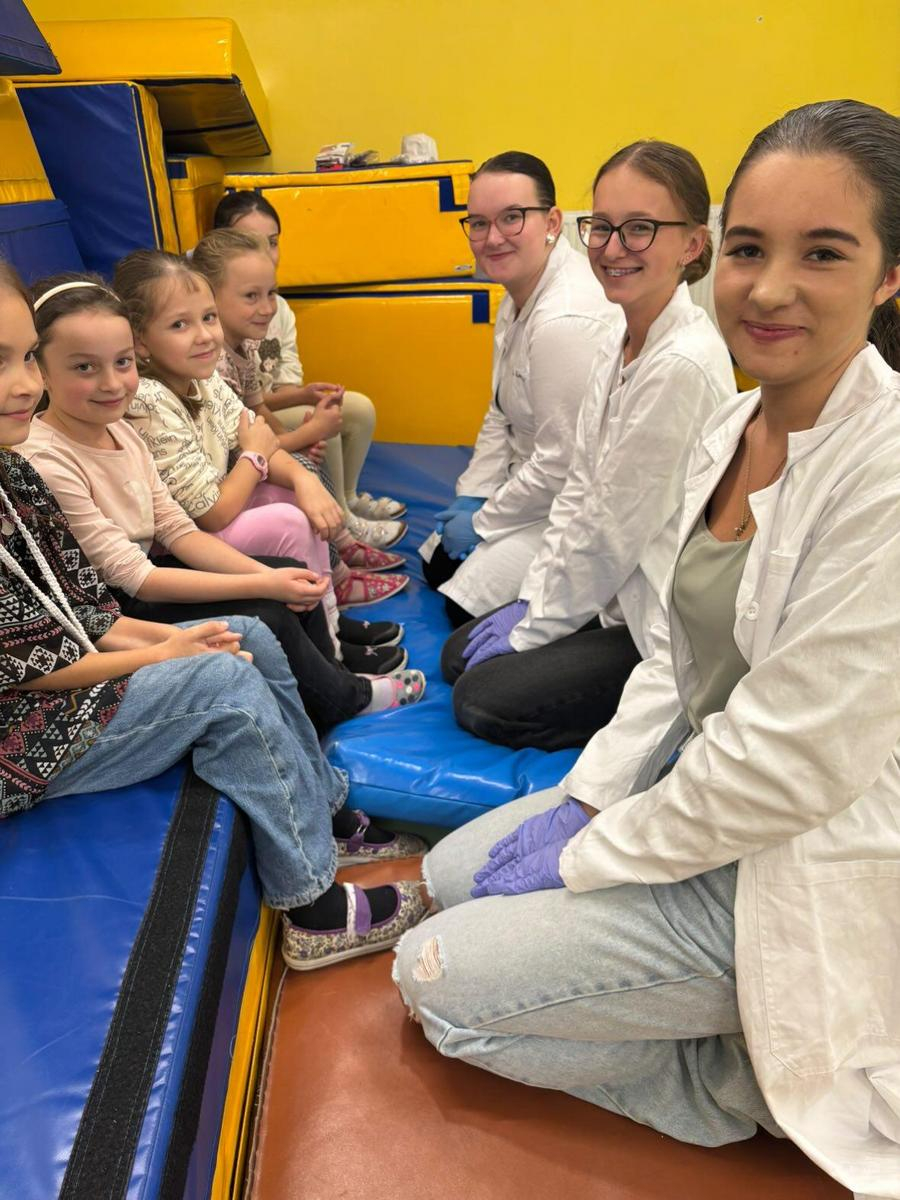 Nedávno sme zorganizovali návštevu 60 druhákov v školskom klube na ZŠ MŠ Francisciho v Poprade. Táto akcia umožnila mladším žiakom nahliadnuť do práce budúcich zdravotníkov formou ukážok obväzovej techniky, laickej prvej pomoci, modelových situácií a edukačných hier. Krúžok tak podporuje nielen odborné vzdelávanie, ale aj rozvoj empatie, ochoty pomáhať a praktických kompetencií, ktoré sú nevyhnutné pre výkon zdravotníckeho povolania.